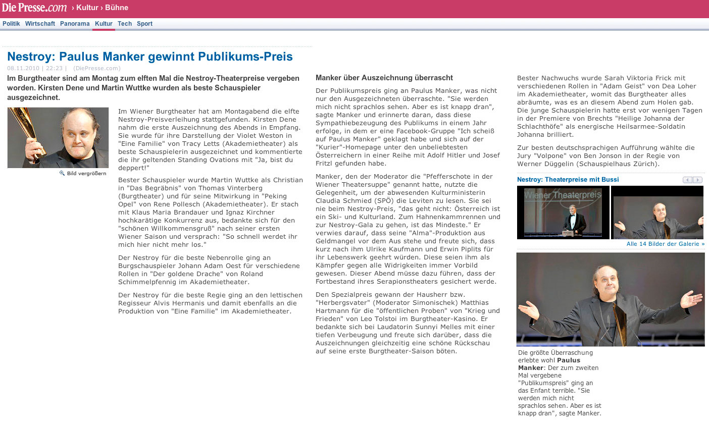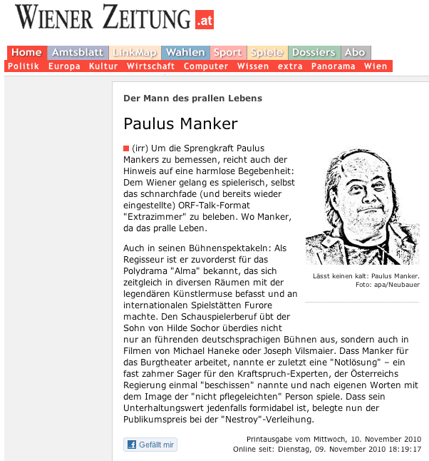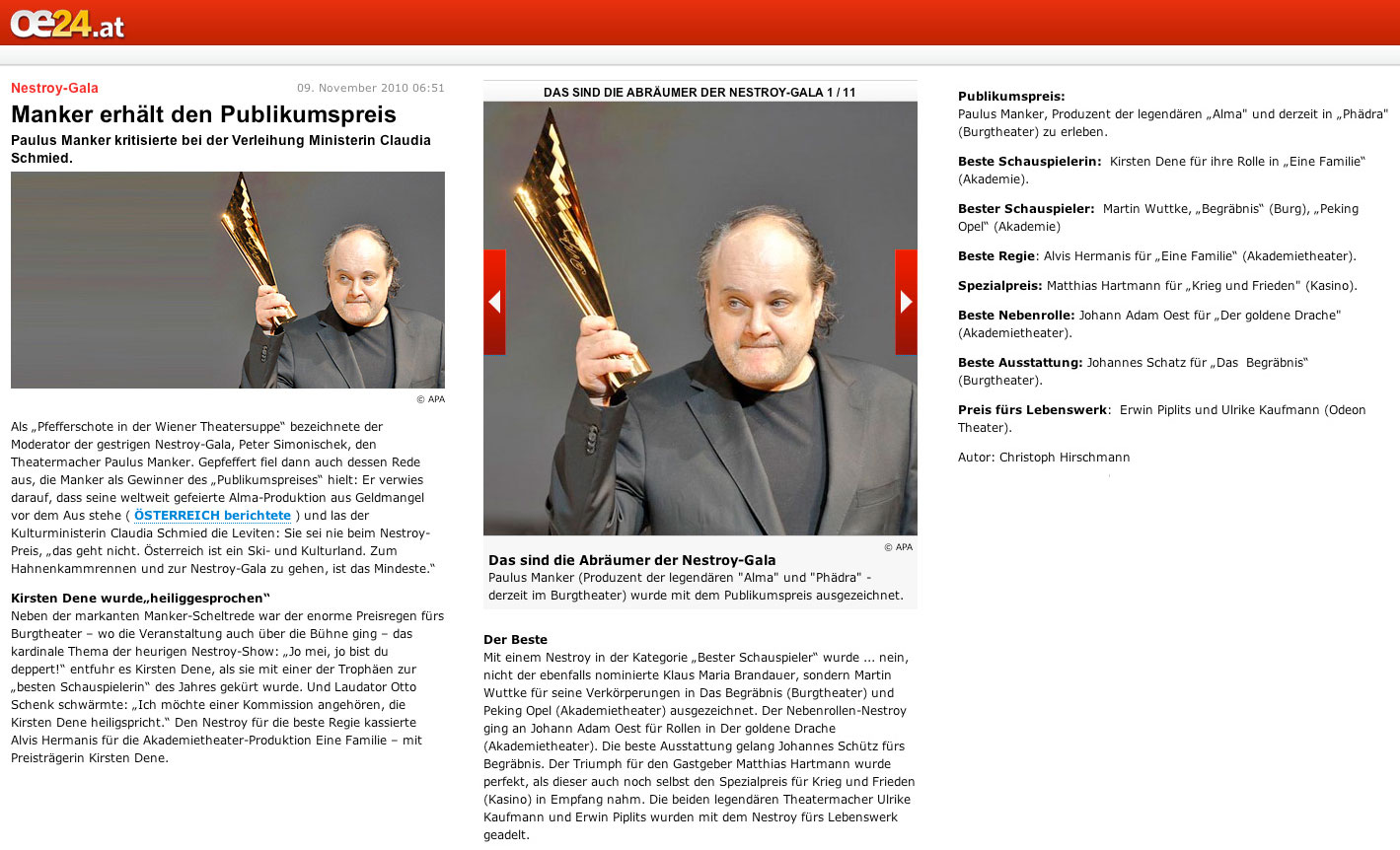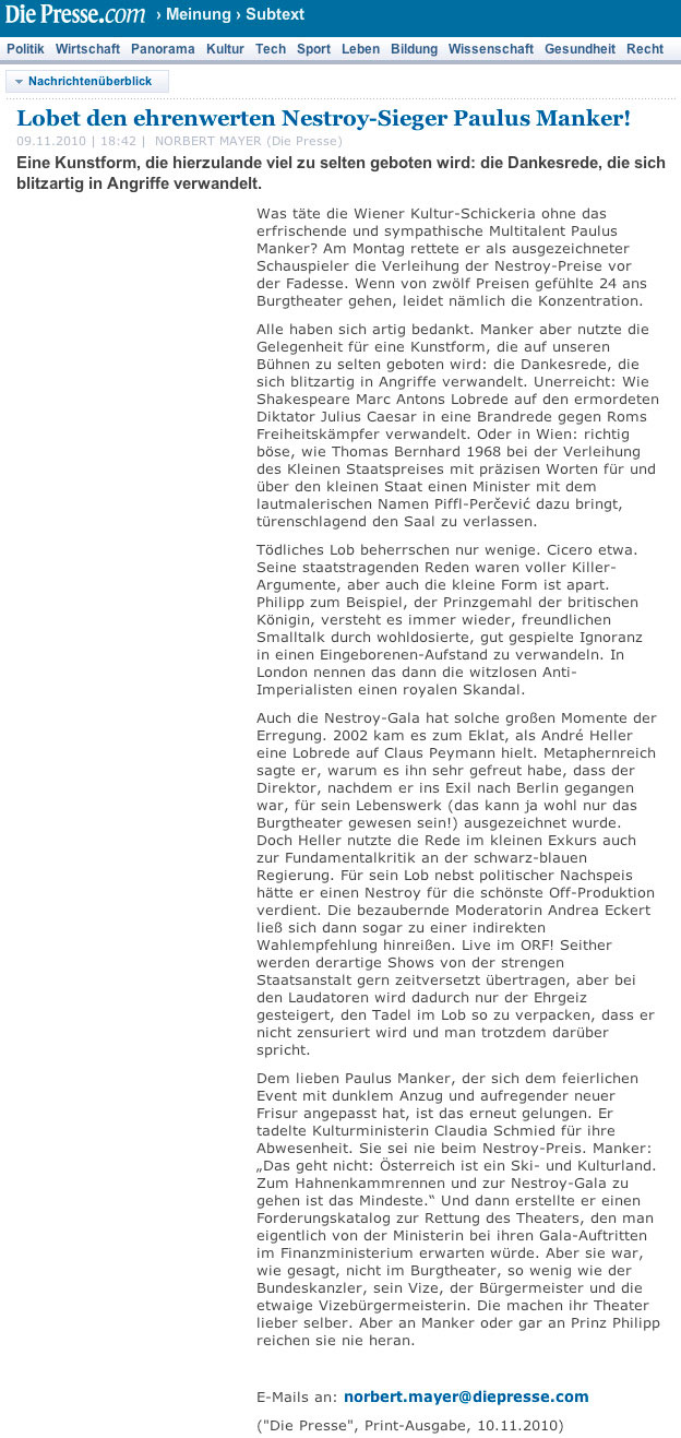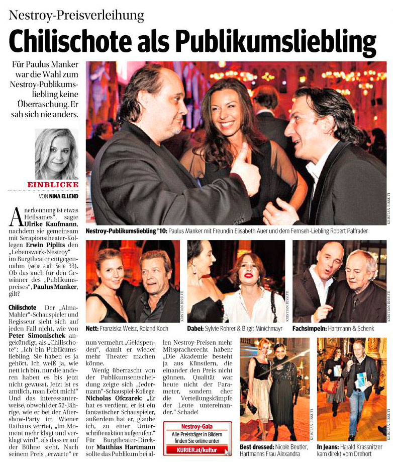 Lobet den ehrenwerten NESTROY-Sieger Paulus Manker! Was täte die Wiener Kultur-Schickeria ohne das erfrischende und sympathische Multitalent Paulus Manker? … Alle haben sich artig bedankt. Manker aber nutzte die Gelegenheit