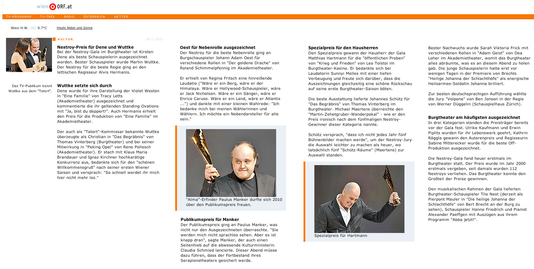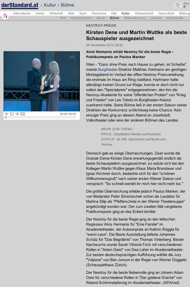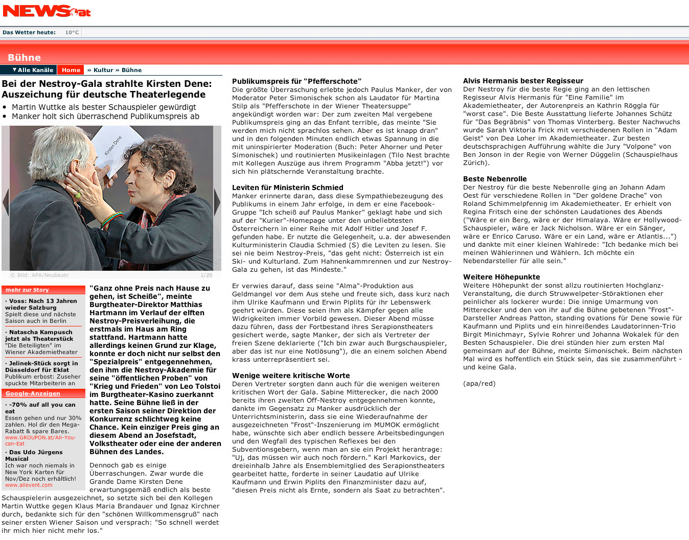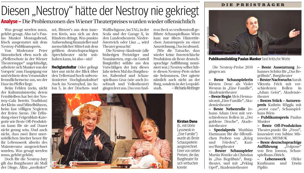 NESTROY-Preis an Kirsten Dene und Martin Wuttke. Dene kommentierte die ihr geltenden Standing Ovations mit "Ja, bist du deppert!". Wuttke … bedankte sich für den "schönen Willkommensgruß" nach seiner ersten Wiener Saison und versprach: "So schnell werdet ihr mich hier nicht mehr los."