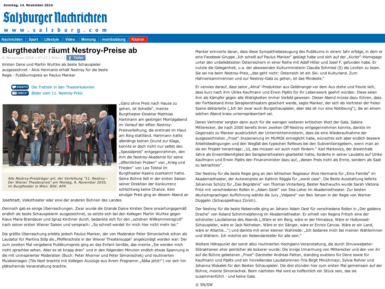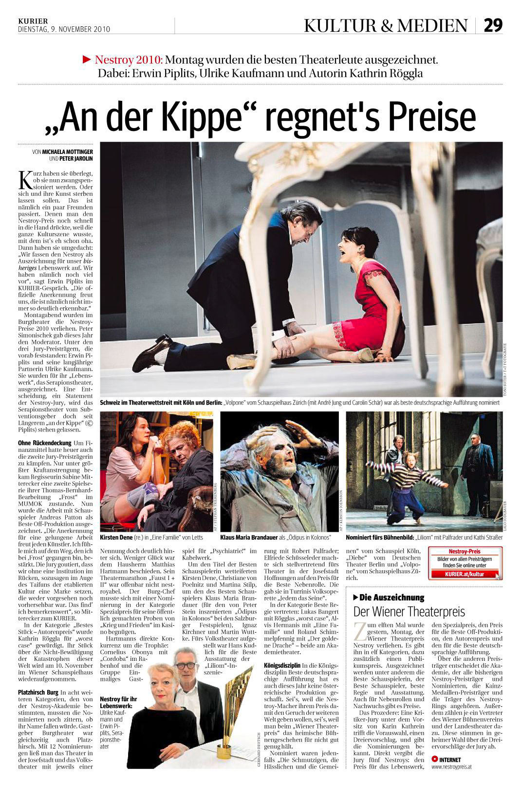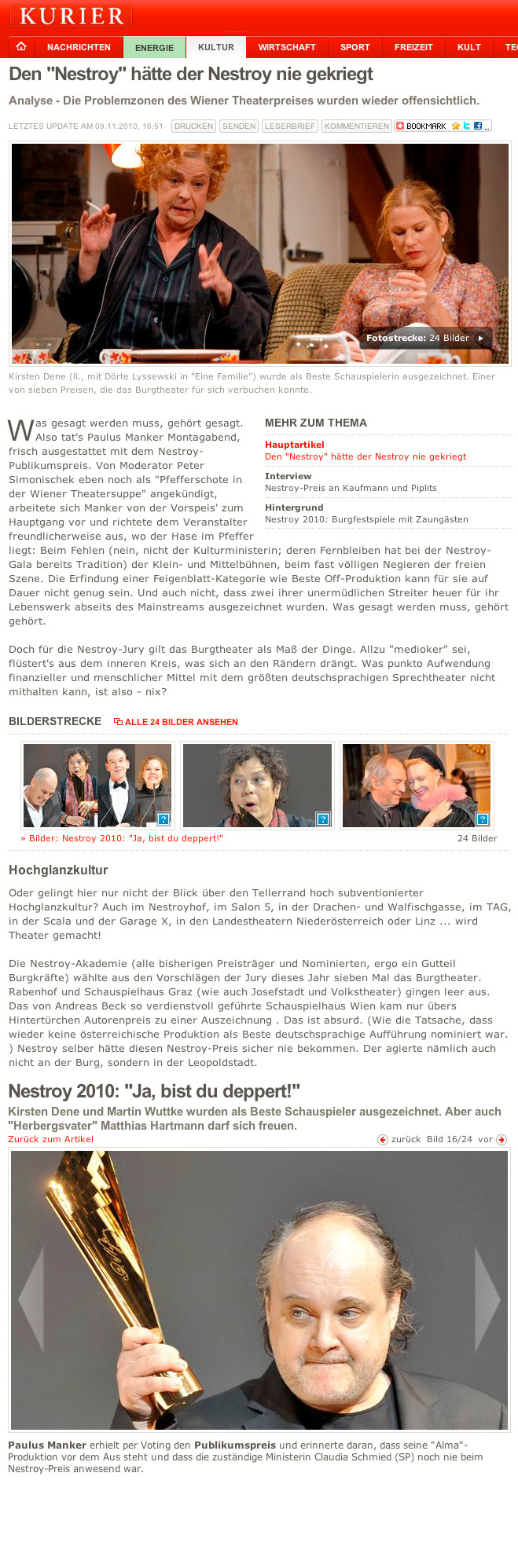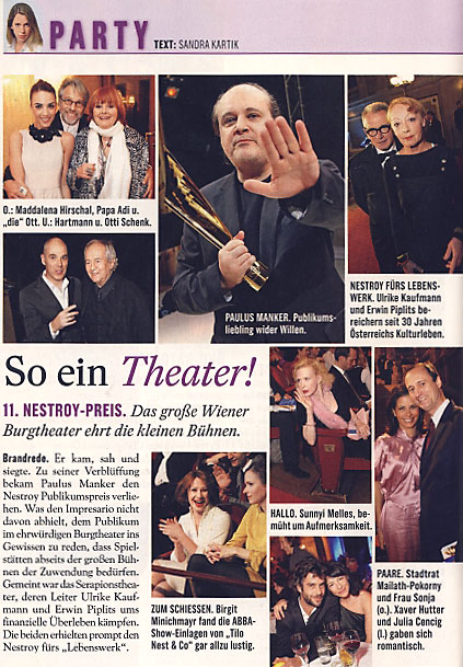 NESTROY-Preis an Kirsten Dene und Martin Wuttke. Dene kommentierte die ihr geltenden Standing Ovations mit "Ja, bist du deppert!". Wuttke … bedankte sich für den "schönen Willkommensgruß" nach seiner ersten Wiener Saison und versprach: "So schnell werdet ihr mich hier nicht mehr los."
